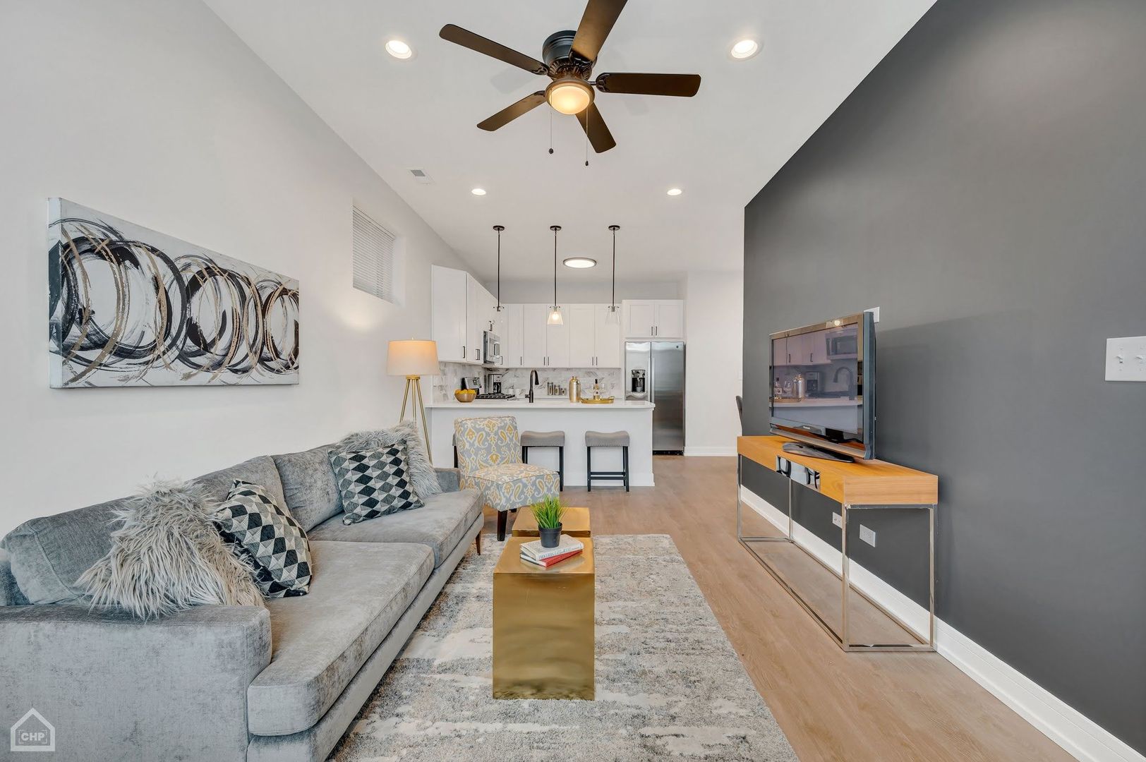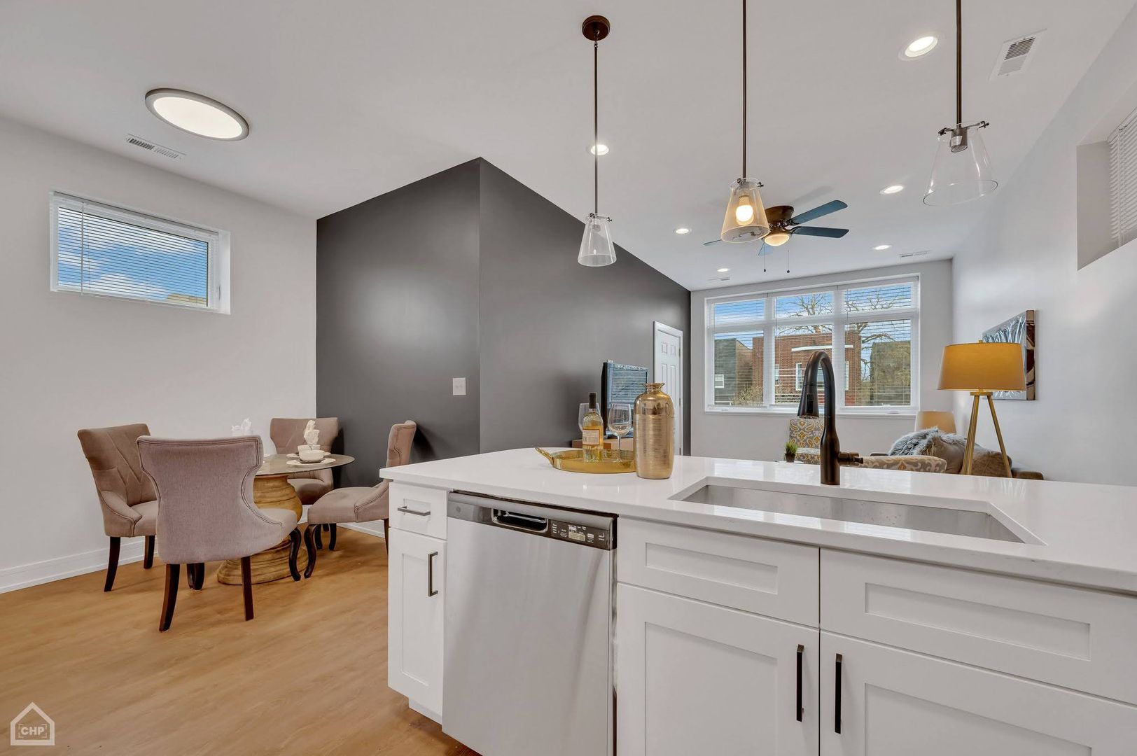 Designed with modern sophistication, the home features a fully appointed chef’s kitchen with shaker-style white cabinetry, stainless steel appliances, a quartz island, and a custom full-height backsplash. Durable and stylish LVT flooring runs throughout, complementing the home’s clean, contemporary aesthetic.