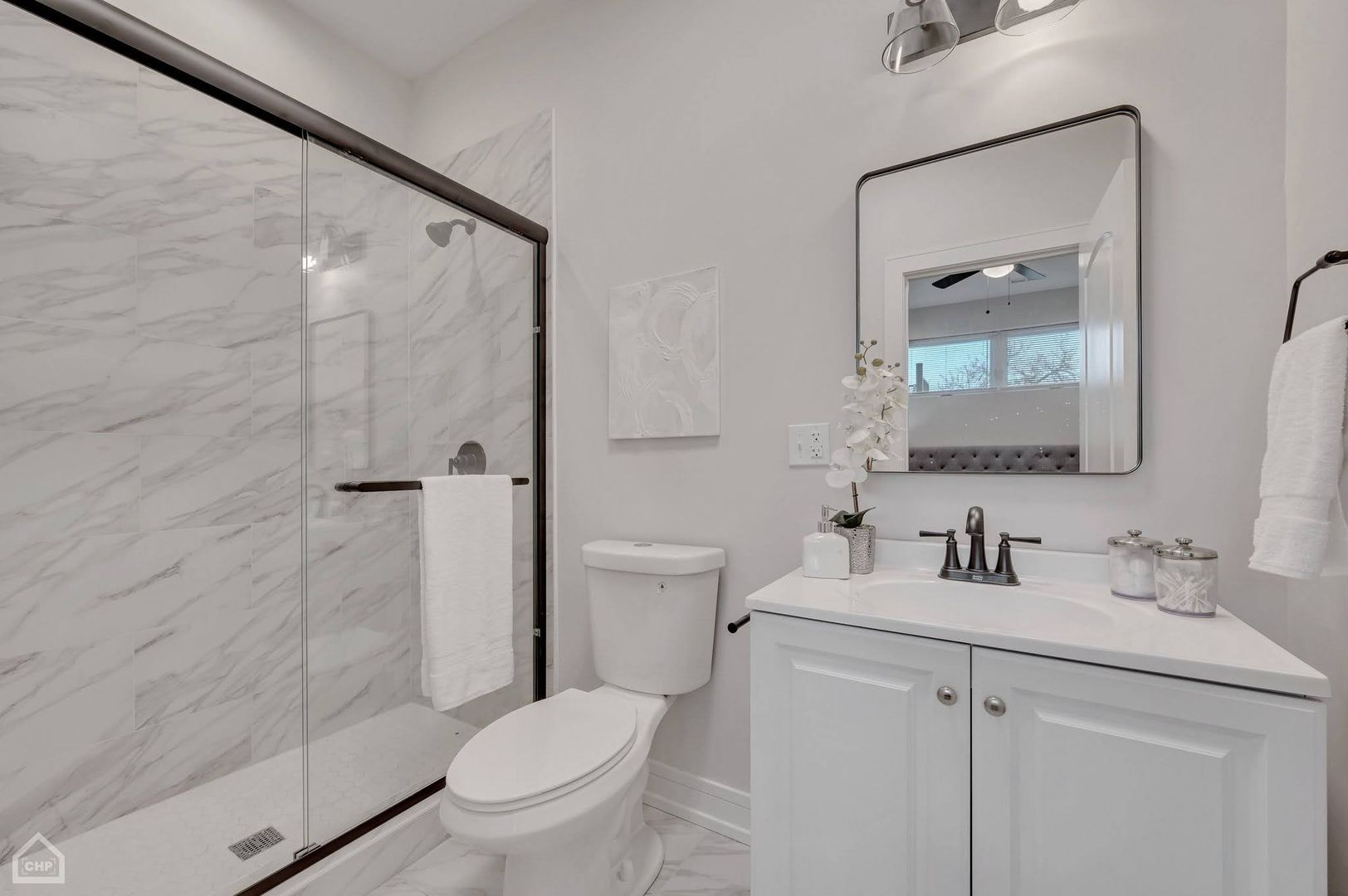 The open-concept living space is bright and inviting, complete with a dedicated breakfast nook for casual dining. Secondary bedrooms comfortably accommodate queen-sized furnishings, while the spacious primary suite offers a walk-in closet and a spa-inspired bath featuring an oversized glass-enclosed shower and sleek black plumbing fixtures.